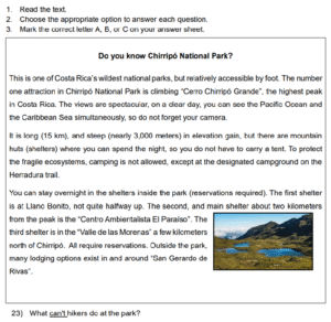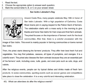 Examen Ingles 7mo /10 Examen de 7mo - Ingles Este examen para practicar Ingles 7mo. 1 / 10 1) At a drugstore 2) On Central Avenue 3) At the clinic 2 / 10 1) Selling typical products 2) Enjoying the blessing of animals 3) To honor a saint 3 / 10 1) There is a laboratory on the island. 2) It has a rainforest. 3) Visitors cannot practice snorkeling. 4 / 10 1) Private art classes 2) After-school classe 3) A teacher of arts 5 / 10 1) Fifteen 2) Thirteen 3) Seven 6 / 10 1) flora 2) views 3) fauna 7 / 10 1) $2 2) $20 3) $15 8 / 10 1) ₡1000 2) ₡1500 3) ₡500 9 / 10 1) 7:30 p.m. 2) 10:30 a.m. 3) 9:30 p.m. 10 / 10 1) Facts about Cocos Island 2) Tourist packages to visit Cocos Island 3) Places to visit on Cocos Island Déjanos tus datos para que puedas aprender con nuestros profesionales Tu puntación es 0% Reinicia el cuestionario Salir Clic para volver a pagina principal