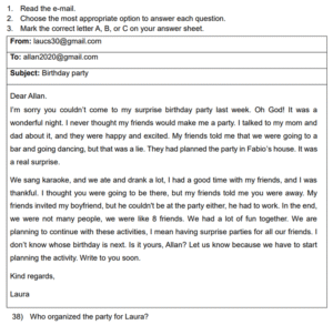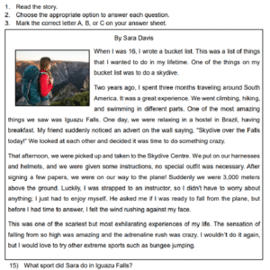 Examen Ingles 8vo /10 Examen de 8vo - Ingles Este examen para practicar Ingles 8vo. 1 / 10 1) A member of the Olympic Committee 2) An athlete from Greece 3) The chief of state 2 / 10 1) wasn’t invited 2) had to work 3) didn’t know about it 3 / 10 1) the Central Park 2) the high school playground 3) the high school gym 4 / 10 1) Uniform 2) Ball 3) Shoes 5 / 10 1) In Lorena’s house 2) At a park 3) In Mario’s house 6 / 10 1) Her parents 2) Her friends 3) Allan 7 / 10 1) France 2) Japan 3) Brazil 8 / 10 1) Swimming 2) Skydiving 3) Hiking 9 / 10 1) take a rafting tour 2) go horseback riding 3) climb the top of a volcano 10 / 10 1) A special outfit 2) A helmet and a harness 3) No equipment is necessary Déjanos tus datos para que puedas aprender con nuestros profesionales Tu puntación es 0% Reinicia el cuestionario Salir Clic para volver a pagina principal
