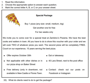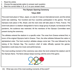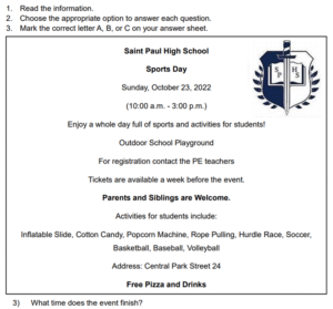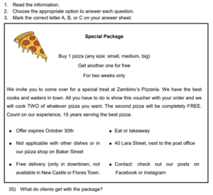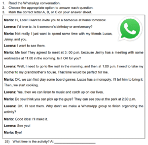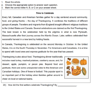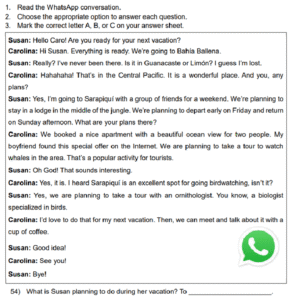 Examen Ingles 8vo /10 Examen de 8vo - Ingles Este examen para practicar Ingles 8vo. 1 / 10 1) Skydiving 2) Bungee jumping 3) Climbing 2 / 10 1) had to work 2) didn’t know about it 3) wasn’t invited 3 / 10 1) express gratitude to family 2) thank you for the past year 3) hold big feasts 4 / 10 1) A school 2) A hospital 3) A police station 5 / 10 1) It was scary. 2) She would do it again. 3) She wants to repeat it. 6 / 10 1) On Central Avenue 2) Next to the school 3) Behind the school 7 / 10 1) She went dancing with her boyfriend. 2) She sang karaoke with her friends. 3) She went clubbing with some friends. 8 / 10 1) The Pacific Coast 2) Manuel Antonio 3) La Fortuna 9 / 10 1) Two 2) Four 3) Three 10 / 10 1) Tennis shoes 2) Uniform 3) Soccer shoes Déjanos tus datos para que puedas aprender con nuestros profesionales Tu puntación es 0% Reinicia el cuestionario Salir Clic para volver a pagina principal