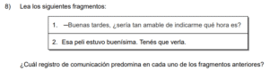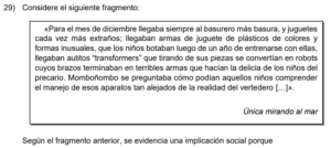 Examen de Español 9no /10 Examen de 9no - Español 1 Este examen para practicar Español de Noveno. 1 / 10 1) Los testimonios son poco confiables si ha pasado mucho tiempo del evento. 2) Los recuerdos son producto de experiencias pasadas y conocimientos generales. 3) La memoria es la grabación de un conjunto de recuerdos pasados. 2 / 10 1) todas las prácticas existentes para proteger el medioambiente. 2) una práctica de acumulación y reemplazo de bienes y servicios. 3) el consumo responsable y ajustado a las necesidades reales. 3 / 10 1) autoridad. 2) multitud. 3) fuerza. 4 / 10 1) 1 Informal 2 Formal 2) 1 Formal 2 Informal 3) 1 Formal 2 Formal 5 / 10 1) exponer la técnica empleada por la zarigüeya para escapar de sus depredadores. 2) mostrar el comportamiento salvaje e involuntario de la zarigüeya ante el peligro. 3) recalcar que la zarigüeya no es un aperitivo para sus depredadores. 6 / 10 1) Tiende a las oraciones largas. 2) Utiliza un léxico más variado. 3) Suele utilizar fórmulas de confianza. 7 / 10 1) 1 Informal 2 Informal 2) 1 Informal 2 Formal 3) 1 Formal 2 Informal 8 / 10 1) el aumento de la población urbana agrava el problema de la basura. 2) evidencia la desigualdad social en detrimento de las clases desprotegidas. 3) la disminución de las fuentes de trabajo genera el abandono de los niños. 9 / 10 1) 1 traerá 2 dijieron 2) 1 trajió 2 dicieron 3) 1 trajo 2 dijeron 10 / 10 1) estaba muy emocionado. 2) sentía mucho calor. 3) tenía la piel seca. Déjanos tus datos para que puedas aprender con nuestros profesionales Tu puntación es 0% Reinicia el cuestionario Salir Clic para volver a pagina principal