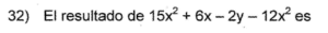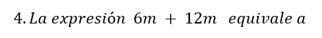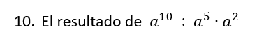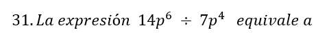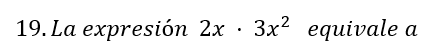 Examen de Pendiente 5 /10 Examen de Algebra 8vo Este examen para practicar solo contiene 10 preguntas de Algebra 1 / 10 1) 12x⁸ 2) 12x⁴ 3) 12x¹² 2 / 10 1) x² y² 2) 2x² y 3) y² x 3 / 10 1) 5a 2) 14a 3) 9a 4 / 10 1) 3a² 2) 3a 3) 10a 5 / 10 1) 6y 2) y² 3) 8y 6 / 10 1) 3 m3 2) 2 m4 3) 2 m3 4) 3 m4 7 / 10 1) p(x) = 850 - 100x 2) p(x) = 100x 3) p(x) = 750x 4) p(x) = 850 + 100x 8 / 10 1) a⁷ 2) a⁴ 3) a¹⁰ 9 / 10 1) a¹⁵ 2) a¹⁰⁰ 3) a²⁸ 10 / 10 1) 30 2) 32 3) 16 4) 11 Déjanos tus datos para que puedas aprender con nuestros profesionales Tu puntación es 0% Reinicia el cuestionario Salir Clic para volver a pagina principal