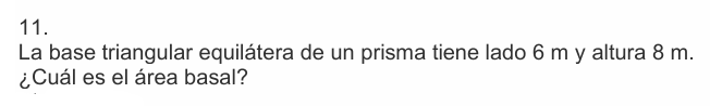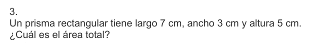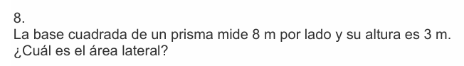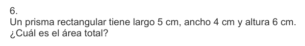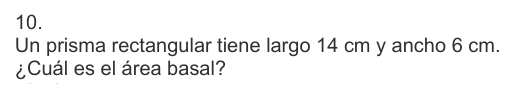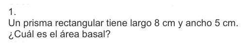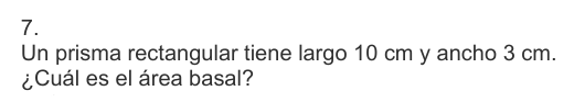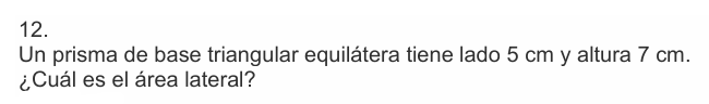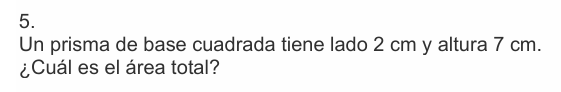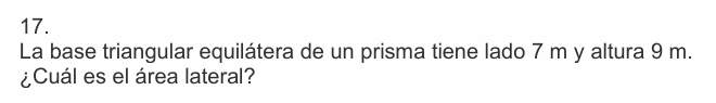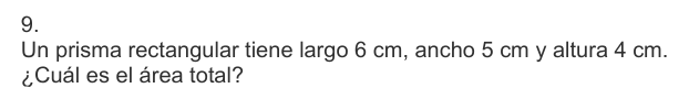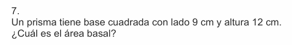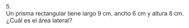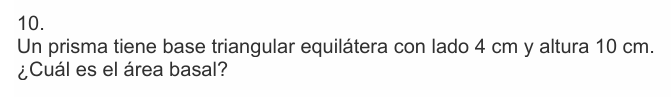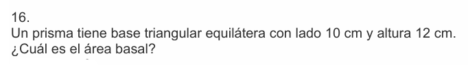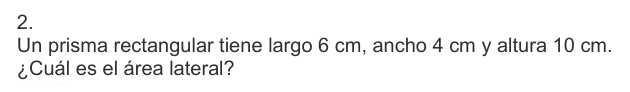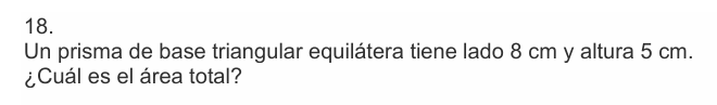 Examen de Figuras 3d - Prismas /10 Examen para 9no - Mate Figuras en 3d - Prismas Este examen para practicar solo contiene 10 preguntas de Figuras en 3d - Prismas (de base cuadrada, triangular y rectangular) 1 / 10 1) 168 m² 2) 210 m² 3) 189 m² 2 / 10 1) 18 cm² 2) 81 cm² 3) 162 cm² 3 / 10 1) 40 cm² 2) 26 cm² 3) 80 cm² 4 / 10 1) 96 m² 2) 72 m² 3) 192 m² 5 / 10 1) 43.30 cm² 2) 25.00 cm² 3) 86.00 cm² 6 / 10 1) 240 cm² 2) 216 cm² 3) 360 cm² 7 / 10 1) 120 cm² 2) 105 cm² 3) 90 cm² 8 / 10 1) 148 cm² 2) 208 cm² 3) 188 cm² 9 / 10 1) 60 cm² 2) 56 cm² 3) 64 cm² 10 / 10 1) 160.00 cm² 2) 139.43 cm² 3) 153.43 cm² Déjanos tus datos para que puedas aprender con nuestros profesionales Tu puntación es 0% Reinicia el cuestionario Salir Clic para volver a pagina principal