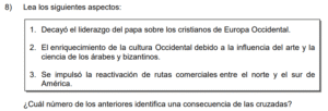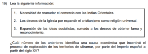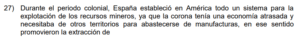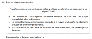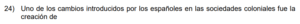 Examen de Sociales 9no /10 Examen de 9no - Sociales 1 Este examen para practicar Sociales de Noveno. 1 / 10 1) el transporte de productos de América a Europa sin las debidas medidas sanitarias. 2) el adecuado almacenamiento de los granos básicos y la preparación antes de consumirlos. 3) la insalubridad de las calles europeas y la carencia de agua potable. 2 / 10 1) han contribuido con la afectación del medio ambiente y por ende del cambio climático. 2) han sido corregidas por completo sin que quede rastro de sus consecuencias. 3) son las únicas responsables, a nivel mundial, de la catástrofe ambiental que enfrentamos. 3 / 10 1) instituciones como las Capitanías Generales con funciones políticas, militares y estratégicas. 2) asociaciones de desarrollo para la organización de cada pueblo bajo su dominio. 3) cacicazgos para mantener el control político mediante el poder local. 4 / 10 1) oro y plata. 2) petróleo y oro. 3) cobre y jade. 5 / 10 1) Consolidó una cultura teocéntrica en la que el pensamiento estuvo sometido a los dogmas y las creencias religiosas. 2) Fomentó el antropocentrismo como la principal doctrina de vida. 3) Creó una sociedad con libertad de pensamiento religioso, lo que favoreció el surgimiento de nuevas doctrinas. 6 / 10 1) Proteger el proceso de mestizaje que era importante para los europeos y así preservar su grupo étnico. 2) Legitimar la explotación y la esclavitud a la que fueron sometidas las poblaciones aborígenes y afrodescendientes. 3) Salvaguardar la dignidad y el respeto a las tradiciones y cosmovisión de los grupos autóctonos de América. 7 / 10 1) Las principales construcciones se realizaron en acero lo que ha permitido que se conserven hasta hoy. 2) Surgió la arquitectura gótica cuya construcción brinda un aspecto de elevación hacia el cielo, representando la grandeza de Dios. 3) La arquitectura se caracterizó por presentar dimensiones pequeñas y con poca altura. 8 / 10 1) es el primer exportador de frutas y verduras del continente americano. 2) posee un sector agropecuario poco explotado. 3) cuenta con un potencial agrícola relevante. 9 / 10 1) evitar reemplazar a los trabajadores que mostraran signos de agotamiento por el trabajo extenuante. 2) reivindicar los derechos laborales con el fin de obtener mejores beneficios. 3) concientizar a los patronos sobre la importancia de sustituir la mano de obra humana por máquinas, y así evitar la explotación laboral. 10 / 10 1) Astrolabio 2) Sextante 3) Brújula Déjanos tus datos para que puedas aprender con nuestros profesionales Tu puntación es 0% Reinicia el cuestionario Salir Clic para volver a pagina principal