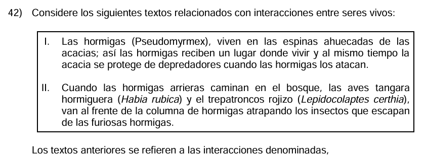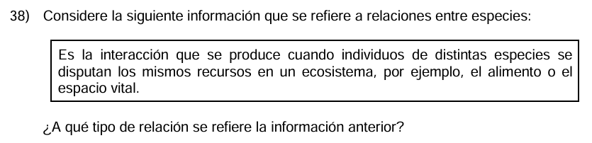 Biología Bachi - Relaciones en Ecosistemas /10 Práctica para Bachi - Biología - Relaciones en Ecosistemas Esta prueba es para practicar el tema Relaciones en Ecosistemas de Biología para Bachillerato. 1 / 10 Cuando dos especies distintas consumen el mismo recurso limitado, como semillas en escasez, y ambas se ven afectadas, se presenta qué tipo de competencia. 1) Intraespecífica 2) Comensalismo 3) Interespecífica 2 / 10 1) I reproductoras y II protectoras. 2) I competencia y II depredación. 3) I competencia y II mutualismo. 4) II mutualismo y II comensalismo. 3 / 10 Un insecto que consume hojas de una planta reduciendo su capacidad de crecer demuestra un tipo de relación en la que un organismo aprovecha recursos de otro. 1) Competencia 2) Explotación 3) Mutualismo 4 / 10 Cuando dos individuos de la misma especie compiten por alimento en un área limitada, se trata de qué tipo de relación ecológica. 1) Amensalismo 2) Competencia intraespecífica 3) Competencia interespecífica 5 / 10 1) Comensalismo. 2) Mutualismo. 3) Competencia intraespecífica. 4) Competencia interespecífica. 6 / 10 Si un zorro y un gato montés cazan el mismo tipo de presa en un ecosistema, están participando en cuál tipo de relación ecológica. 1) Competencia interespecífica 2) Mutualismo 3) Explotación 7 / 10 La relación en la que un depredador regula las poblaciones de sus presas al consumirlas constantemente se clasifica dentro de qué tipo de interacciones ecológicas del ecosistema. 1) Comensalismo 2) Depredación 3) Parasitismo 8 / 10 En una relación de dos especies interactúan de manera que ambas obtienen beneficios importantes, como ocurre entre abejas y flores al intercambiar néctar y polinización. 1) Parasitismo 2) Depredación 3) Mutualismo 9 / 10 Cuando dos poblaciones animales comparten territorio pero no compiten, no se ayudan y tampoco se perjudican en ninguna forma evidente, se clasifica como qué tipo de relación ecológica. 1) Neutralismo 2) Depredación 3) Mutualismo 10 / 10 Las bacterias intestinales que ayudan a los humanos a digerir alimentos mientras obtienen un hogar y nutrientes son un claro ejemplo de qué tipo de relación ecológica. 1) Mutualismo 2) Neutralismo 3) Depredación Déjanos tus datos para que puedas aprender con nuestros profesionales Tu puntación es 0% Reinicia el cuestionario Salir Clic para volver a pagina principal