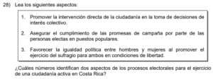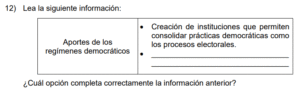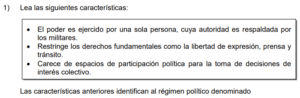 Examen de Cívica Bachi /10 Examen de Bachi - Cívica 1 Este examen para practicar Cívica de bachiller. 1 / 10 1) desarrollaran enfrentamientos sociales en la lucha por el poder político. 2) promovieran prácticas de equidad social en la población. 3) eliminaran las diferencias en las manifestaciones culturales de los pueblos. 2 / 10 1) 1 y 3 2) 1 y 2 3) 2 y 3 3 / 10 1) Establecimiento de políticas sociales dirigidas por una persona y que son destinadas a favorecer solamente a los pequeños grupos de poder político. 2) Impulso de políticas socioeconómicas que permitan el desarrollo de sociedades justas y respetuosas de las prácticas inclusivas y de los derechos humanos. 3) Creación de organismos militares encargados de reprimir las manifestaciones populares a favor del desarrollo de prácticas democráticas, inclusivas y solidarias. 4 / 10 1) fomentó el respeto a los derechos humanos en un marco de equidad. 2) aseguró la unificación en las tradiciones culturales de las personas. 3) garantizó la igualdad económica de todas las familias sudafricanas. 5 / 10 1) neoliberalismo. 2) mercantilismo. 3) autoritarismo. 6 / 10 1) crear alianzas internacionales para fortalecer los sistemas de gobiernos dictatoriales. 2) militarizar los países para mejorar su relación con otros, ante situaciones de defensa nacional. 3) fomentar la práctica de valores fundamentales para el desarrollo de las naciones. 7 / 10 1) Establecer relaciones armoniosas con las demás personas centradas en el respeto, la solidaridad, la tolerancia y la comprensión de la diversidad. 2) Tratar a las demás personas con cariño, aprecio y respeto siempre y cuando se pueda obtener beneficio personal de ellas en lo laboral o en el estudio. 3) Hacer comentarios positivos y halagadores a las personas que poseen elevados recursos económicos, para obtener su ayuda o apoyo monetario. 8 / 10 1) asegurar la igualdad en el ingreso económico de la clase trabajadora del país. 2) promover la paz como un elemento fundamental en la convivencia democrática de las sociedades. 3) limitar los acuerdos centroamericanos en materia de educación por cuanto existían amplias diferencias culturales. 9 / 10 1) el Estado velará por la preparación técnica de los trabajadores. 2) la formación técnica de los trabajadores será una función del empleador. 3) se garantizará la educación universitaria de calidad para toda la población. 10 / 10 1) código electoral 2) deuda política 3) campaña electoral Déjanos tus datos para que puedas aprender con nuestros profesionales Tu puntación es 0% Reinicia el cuestionario Salir Clic para volver a pagina principal