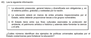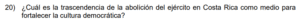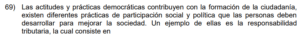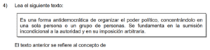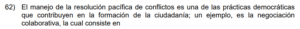 Examen de Cívica Bachi /10 Examen de Bachi - Cívica 1 Este examen para practicar Cívica de bachiller. 1 / 10 1) asumir todas las funciones de la organización para asegurar el éxito en el ejercicio del poder. 2) promover la participación ciudadana mediante el diálogo, la motivación y el compromiso. 3) aprobar la oposición y el disenso en los procesos de negociación política y social. 2 / 10 1) Universidad de Costa Rica 2) Universidad Nacional de Costa Rica 3) Consejo Superior de Educación 3 / 10 1) liberalismo. 2) federalismo. 3) anarquismo. 4 / 10 1) el consenso. 2) la deliberación. 3) la conciliación. 5 / 10 1) Deber 2) Política pública 3) Trabajo de calidad 6 / 10 1) se organizan con el objetivo de obtener recursos económicos de otros países para financiar sus campañas electorales y acceder al poder sin invertir recursos de los partidarios. 2) informan a la población de sus planes y propósitos y permiten la participación democrática de las personas como candidatas en puestos de elección. 3) son agrupaciones utilizadas por las personas para tener periodos de esparcimiento, conocer a otras personas y obtener puestos públicos. 7 / 10 1) Corresponde a una sociedad jurídicamente organizada que posee un territorio, una población, una historia común y un gobierno propio. 2) Es la división político-administrativa más pequeña de una nación, tiene sus propias leyes, idioma y gobierno independiente de la unidad jurídica y política nacional. 3) Recibe ese nombre cada distrito que conforma un país que posee una población superior a los cien millones de habitantes y tiene más de dos idiomas oficiales. 8 / 10 1) Poder 2) Democracia 3) Gobernabilidad 9 / 10 1) autorizar el otorgamiento de las patentes municipales de salud para la apertura de sodas y comercios en los cantones del país. 2) definir la política nacional de salud, formación, planificación y coordinación de todas las actividades públicas y privadas relativas a la salud. 3) capacitar y vigilar el desempeño de los médicos que ofrecen servicios de medicina privada en hospitales y clínicas. 10 / 10 1) exacerbar el racismo, para incrementar las grandes diferencias étnicas entre la población y consolidar los derechos de los grupos superiores. 2) rechazar el sexismo, para erradicar actitudes de discriminación y marginación entre las personas por las diferencias sexuales. 3) eliminar la exclusión social, para lograr que las personas económicamente superiores puedan vivir bien sin pagar impuestos. Déjanos tus datos para que puedas aprender con nuestros profesionales Tu puntación es 0% Reinicia el cuestionario Salir Clic para volver a pagina principal