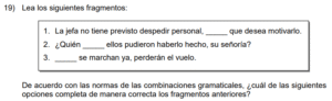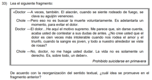 Examen de Español Bachi /10 Examen de Bachi - Español 1 Este examen para practicar Español de bachillerato. 1 / 10 1) Las personas tienen la potestad de tomar sus propias decisiones. 2) Es superable el dolor al estar rodeados de afecto y éxito. 3) Vivir, aun cuando algunas circunstancias provoquen dolor. 2 / 10 1) Enumerar políticas concretas en pro de la justicia social, la igualdad y la sostenibilidad ambiental. 2) Exponer las desigualdades actuales de la sociedad para propiciar un cambio en el futuro. 3) Imponer una forma de pensamiento igualitario para redefinir la justicia y el poder. 3 / 10 1) 1. sino 2. si no 3. Sino 2) 1. si no 2. si no 3. Si no 3) 1. sino 2. sino 3. Si no 4 / 10 1) 1 y 3 2) 2 y 3 3) 1 y 2 5 / 10 1) Suele ser presencial y directo. 2) Utiliza un vocabulario preciso. 3) Evita la repetición y las cacofonías. 6 / 10 1) Pretérito perfecto compuesto 2) Pretérito anterior 3) Presente 7 / 10 1) los castigos que violentan la libertad no son competencia de las leyes humanas. 2) los seres humanos somos incapaces de entender el significado de la libertad. 3) al hacer lo correcto se iguala a Dios porque la justicia es divina. 8 / 10 1) revolucionaria, porque acaba con el sistema político que la ha regido durante siglos. 2) moderna, ya que supera sus tradiciones y adopta las de otras culturas. 3) abierta, porque aprende de otras sociedades para potenciar sus propios conocimientos. 9 / 10 1) 1 y 3 2) 2 y 3 3) 1 y 2 10 / 10 1) 2 2) 1 3) 3 Déjanos tus datos para que puedas aprender con nuestros profesionales Tu puntación es 0% Reinicia el cuestionario Salir Clic para volver a pagina principal