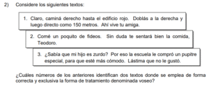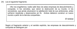 Examen de Español Bachi /10 Examen de Bachi - Español 1 Este examen para practicar Español de bachillerato. 1 / 10 1) pueden experimentar una infinidad de sentimientos dañinos al atravesar el duelo. 2) desean el mal a aquellos que viven perennemente felices. 3) arriesgan, sin excepción, su salud física y mental al dejar de alimentarse. 2 / 10 1) refiere a un término poco aceptado por los pueblos originarios. 2) como denominación, fomenta la creación de un sentido de integración y conexión. 3) es el nombre que el pueblo Kuna asignó a América tras la llegada de los europeos. 3 / 10 1) Oral, los interlocutores utilizan oraciones poco estructuradas. 2) Formal, el léxico es variado y se cuida la gramática en el mensaje. 3) Informal, evita externar emociones y lenguaje coloquial. 4 / 10 1) oportunidad para contemplar el ejercicio como una actividad placentera. 2) posibilidad de sumergirse en mundos imaginarios. 3) sensación de que la mente está libre de preocupaciones. 5 / 10 1) 1 y 2 2) 1 y 3 3) 2 y 3 6 / 10 1) lesionar los intereses de las partes involucradas. 2) resarcir el daño y construir un nuevo mundo más justo. 3) otorgar riqueza sin fin a los vencedores. 7 / 10 1) Pretérito perfecto compuesto 2) Presente 3) Condicional 8 / 10 1) actúa en el cerebro mediante la percepción de emociones negativas. 2) encontró su cura definitiva en las canciones tristes. 3) puede ser regulado, temporalmente, con la ayuda de la música. 9 / 10 1) la risa representa la felicidad y las lágrimas, el desconsuelo absoluto. 2) la tristeza y la risa pueden mezclarse en situaciones adversas. 3) las circunstancias trágicas de la vida se resuelven cuando reímos en lugar de llorar. 10 / 10 1) reflexionan sobre el impacto de las decisiones de consumo. 2) critican la celebración de actividades como el Halloween y la Navidad. 3) resaltan la importancia del consumismo durante la Navidad. Déjanos tus datos para que puedas aprender con nuestros profesionales Tu puntación es 0% Reinicia el cuestionario Salir Clic para volver a pagina principal