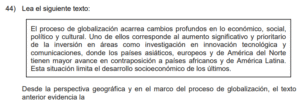 Examen de Sociales Bachi /10 Examen de Bachi - Sociales 1 Este examen para practicar Sociales de bachillerato. 1 / 10 1) Los gobiernos enfrentaron el problema con la aprobación de leyes, penas más fuertes y creación de controles estrictos en las fronteras comunes para evitar la comercialización. 2) Se ha generado una grave situación de violencia cotidiana contra la ciudadanía, creciente inseguridad, asesinatos, sobornos y extorciones que causan tensión y crisis en la región. 3) Afecta solo a las poblaciones consumidoras de droga, porque las familias sufren las consecuencias negativas y sociales; el resto de la sociedad no se ve afectada. 2 / 10 1) Segunda Guerra Mundial. 2) caída del Socialismo real. 3) Revolución rusa. 3 / 10 1) aplicación de políticas inclusivas y solidarias que garantizan el desarrollo integral de las personas. 2) ejecución de principios democráticos de promoción de la paz social y la tolerancia intercultural. 3) vulnerabilidad de la población para promover la defensa efectiva de los derechos humanos. 4 / 10 1) Eliminar las diferencias en las manifestaciones culturales de las personas. 2) Promover el respeto a la diversidad étnica y cultural. 3) Imponer la pena de muerte para los diversos delitos contra la propiedad. 5 / 10 1) limitar el pluralismo político e ideológico en los procesos electorales. 2) posibilitar la discusión respetuosa y activa de temas de interés colectivo. 3) facilitar la imposición de la opinión de las mayorías sobre las minorías. 6 / 10 1) La reducción del tamaño de la administración pública en el marco de los programas de ajuste estructural. 2) El fortalecimiento de una economía agroexportadora y monocultivista. 3) La oposición a la liberalización comercial como medida alternativa para combatir la desigualdad social. 7 / 10 1) los partidarios de la oposición contaban con muy poco apoyo de la población, por eso realizaban actos de violencia para culpar al gobierno y ganar adeptos. 2) el cierre de comercios provocó desabastecimiento y hambruna en los grupos más pobres de la población, porque carecían de recursos para pagar los elevados precios. 3) la sociedad costarricense sufrió un fuerte impacto en su vida cotidiana, porque se vivieron momentos de gran tensión, pugnas entre amigos, vecinos y hasta familiares. 8 / 10 1) Los tratados de paz entre las potencias causaron recelo en las otras naciones europeas, las cuales exigieron una justa distribución de los territorios coloniales en África. 2) La división política de Europa realizada al finalizar la Primera Guerra Mundial fragmentó países y aumentó los conflictos por el dominio de zonas con potencial económico. 3) Los problemas limítrofes y el poco acceso a recursos agrícolas en las colonias produjeron enfrentamientos entre las potencias europeas por dominar nuevos territorios. 9 / 10 1) inequidad espacial de las condiciones sociales y económicas de diversas naciones del mundo. 2) necesidad de reducir la inversión en infraestructura para el desarrollo tecnológico en naciones latinoamericanas. 3) poca relación que existe entre investigación tecnológica y la inserción en el mercado globalizado. 10 / 10 1) El presidente Bernardo Soto aprobó una propuesta del Secretario de Educación Pública para construir cientos de kínder, escuelas y colegios solo para niñas en todo el país. 2) Se formó la Liga Feminista Costarricense en 1929, sus objetivos eran alcanzar el voto femenino, lograr su bienestar social y cultural, y adquirir derechos políticos y civiles. 3) La mayoría de las mujeres buscaban trabajar fuera de la casa, con el objetivo de ser independientes y dejar de estar sometidas por los familiares varones y por sus maridos. Déjanos tus datos para que puedas aprender con nuestros profesionales Tu puntación es 0% Reinicia el cuestionario Salir Clic para volver a pagina principal